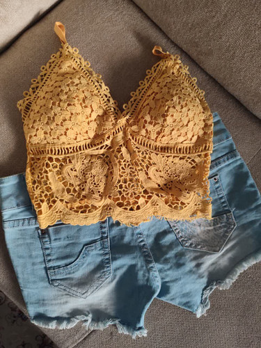 ست نیمتنه و شورت دانتل هارنس دار رنگ خردلی