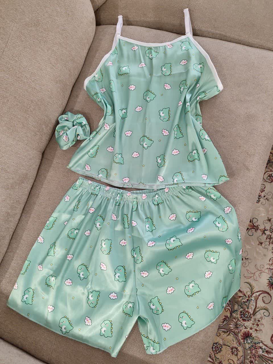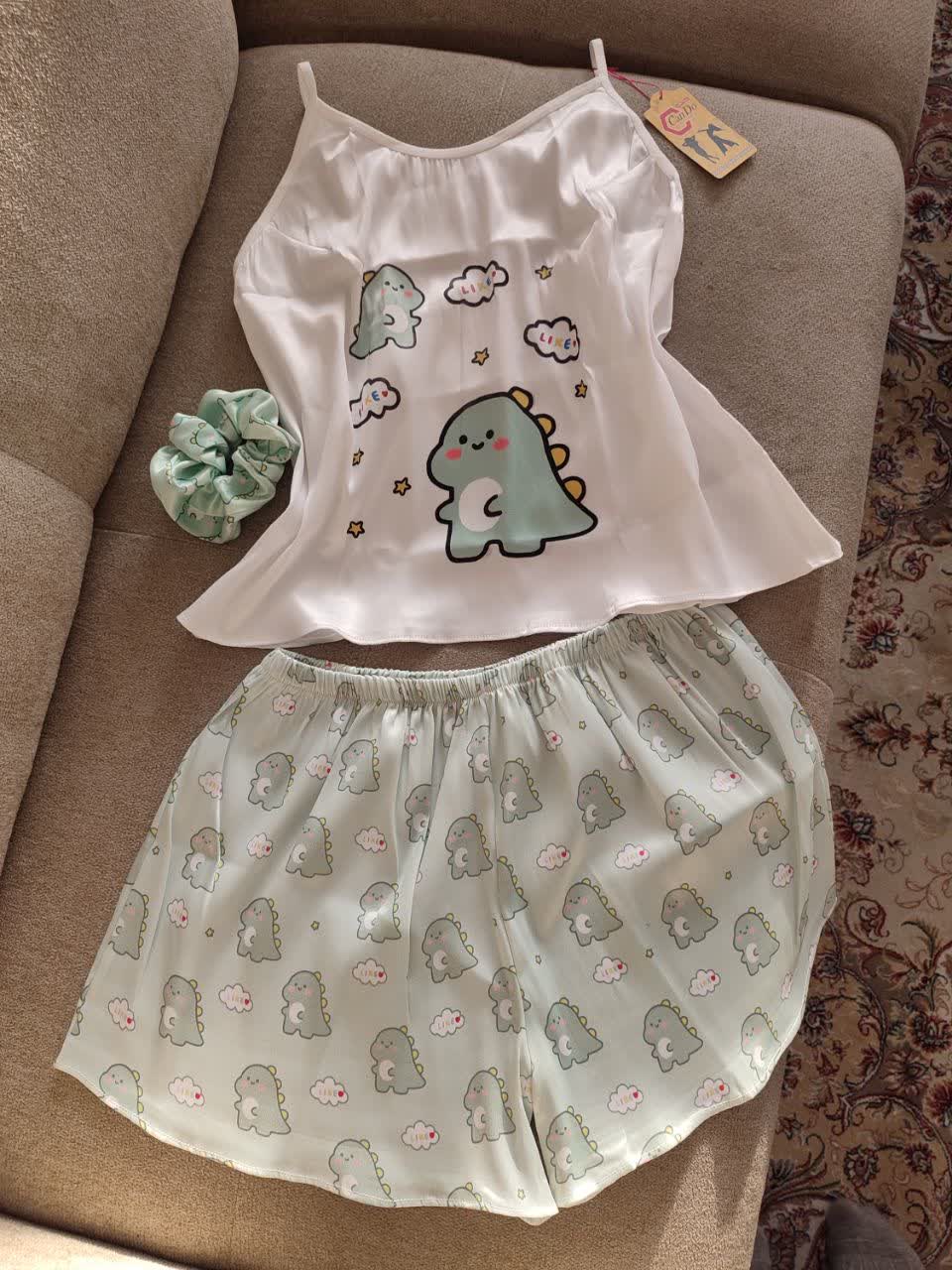 تاپ و شورت ساتن همراه اسکرانچی طرح دایناسوری