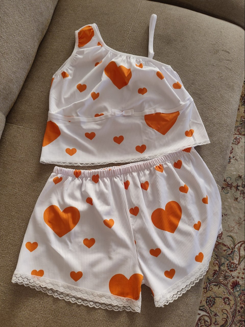 تاپ و شورت کبریتی یقه رومی طرح قلب نارنجی