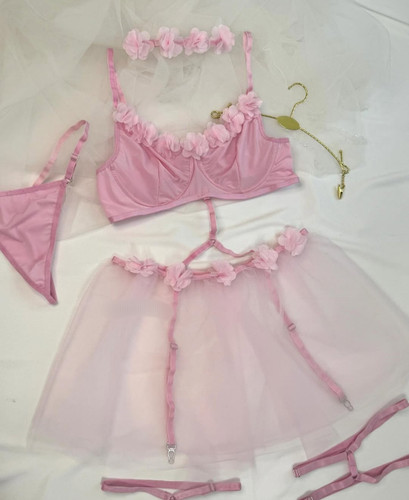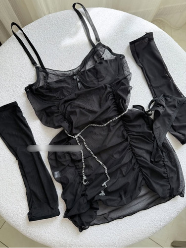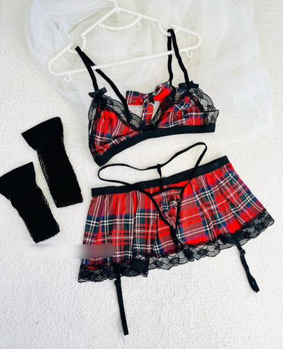 لباس خواب زنانه فانتزی 4 تکه دانتل گارتر دار همراه جوراب بالای زانو