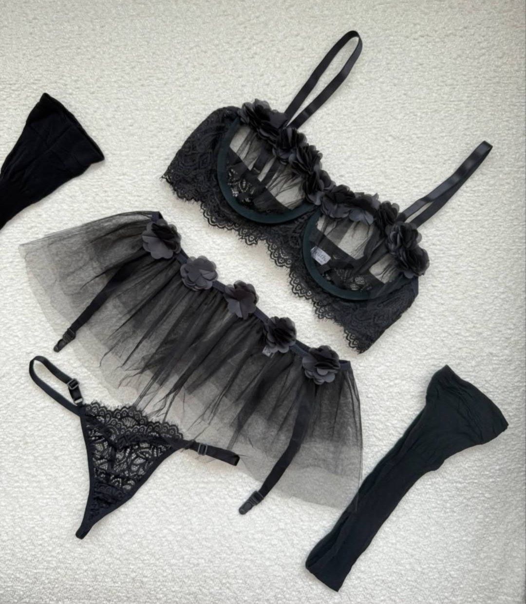 لباس خواب سه تکه فانتزی کاپ باز دانتل همراه جوراب بالای زانو رنگ مشکی