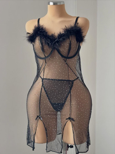 لباس خواب فنردار زنانه پیراهنی تور شیشه ای نگین دار