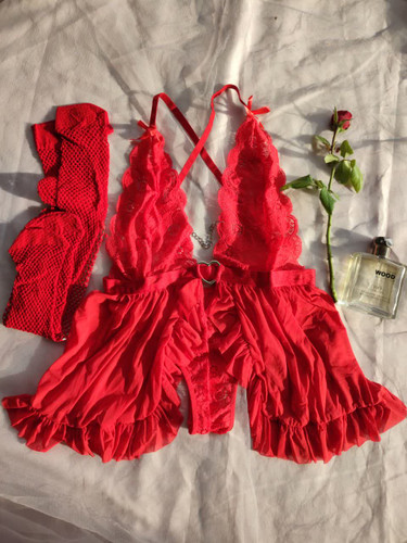 لباس خواب زنانه بادی توری فنردار قزن دار به همراه ران بند رنگ قرمز