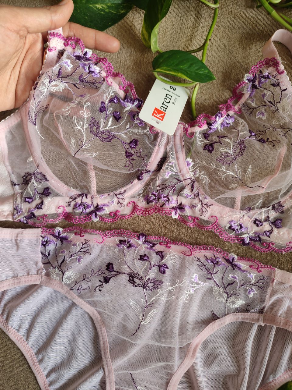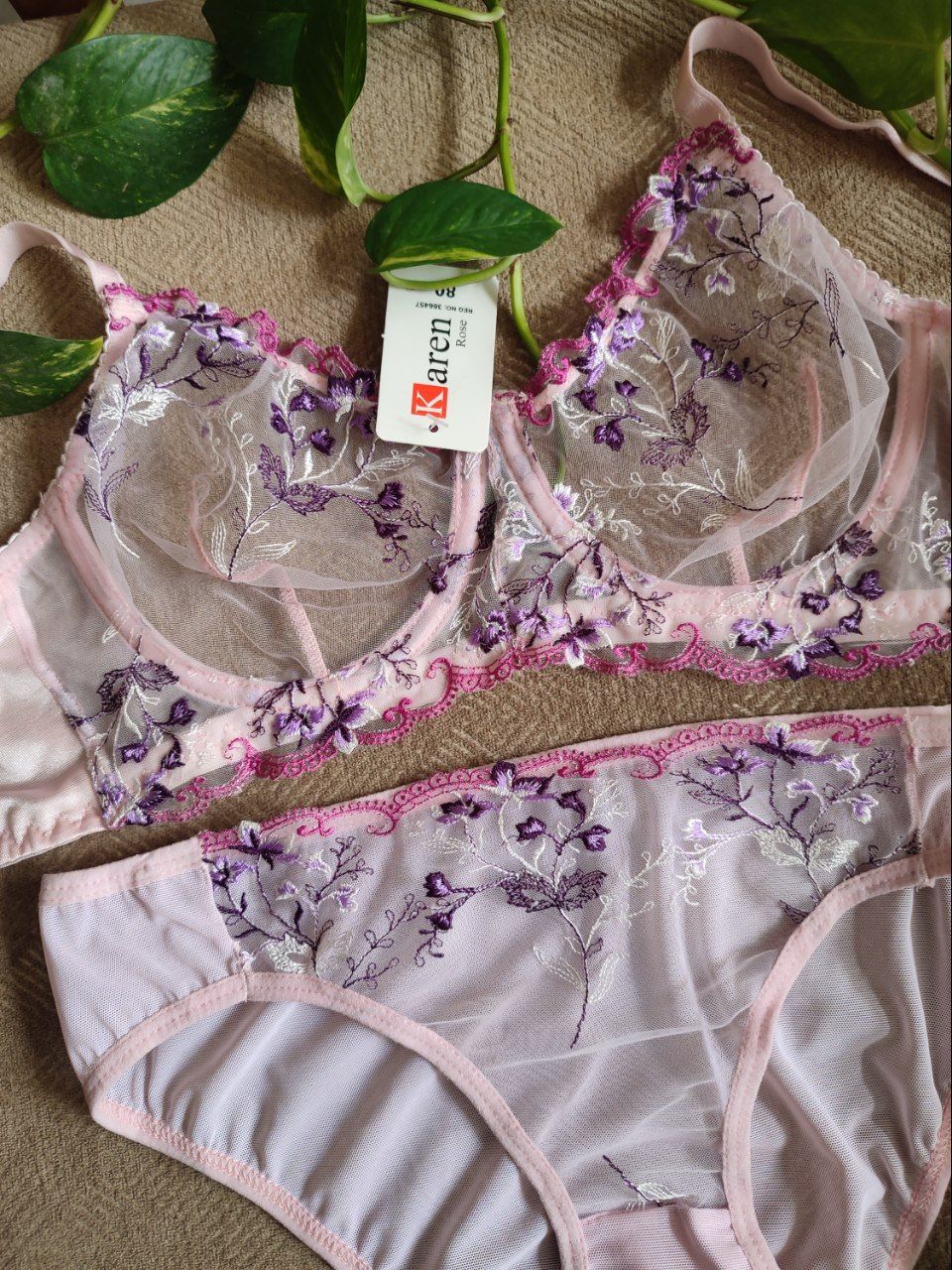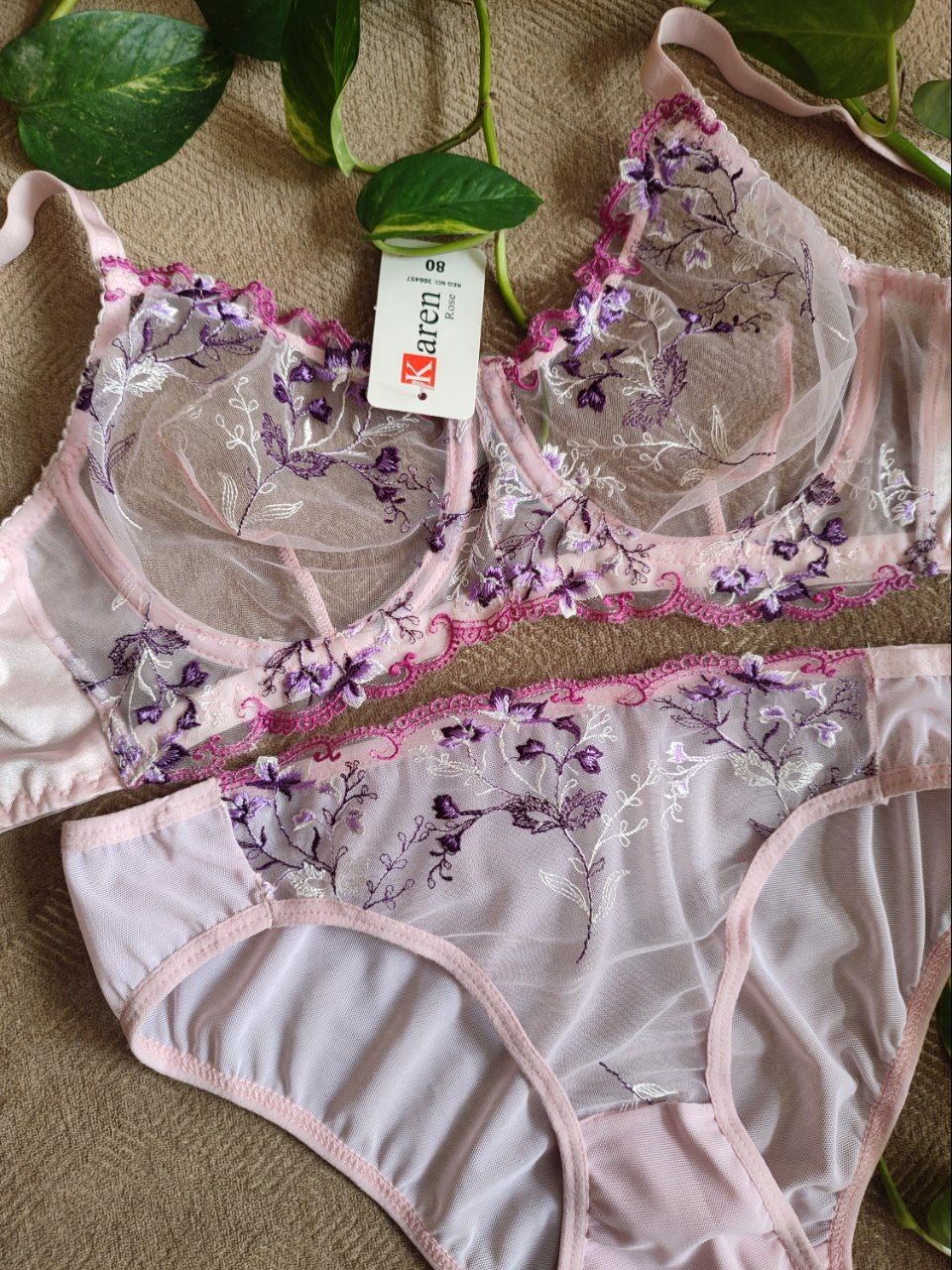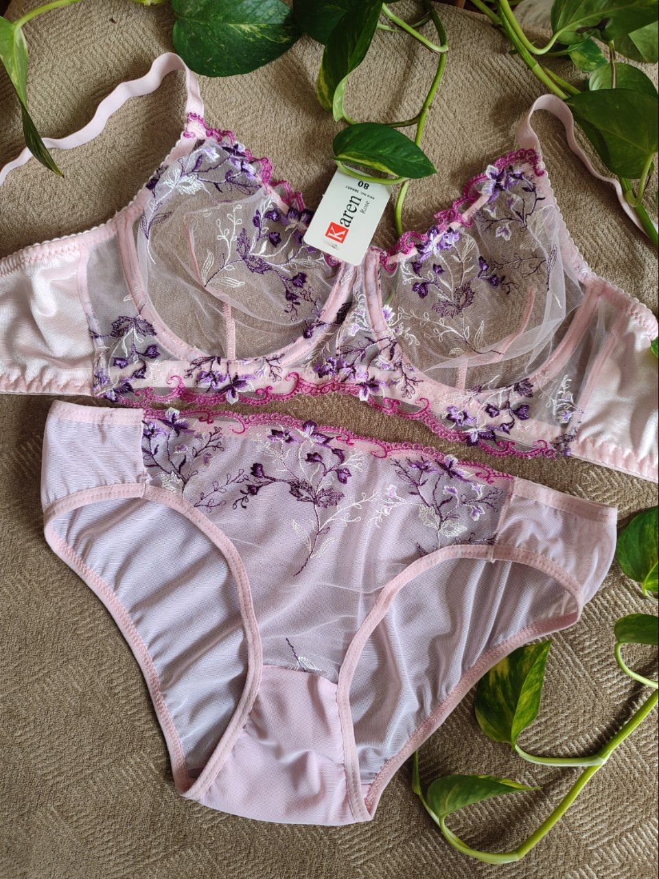 ست لباس زیر زنانه فنردار توری گلدوزی برند کارن رنگ صورتی