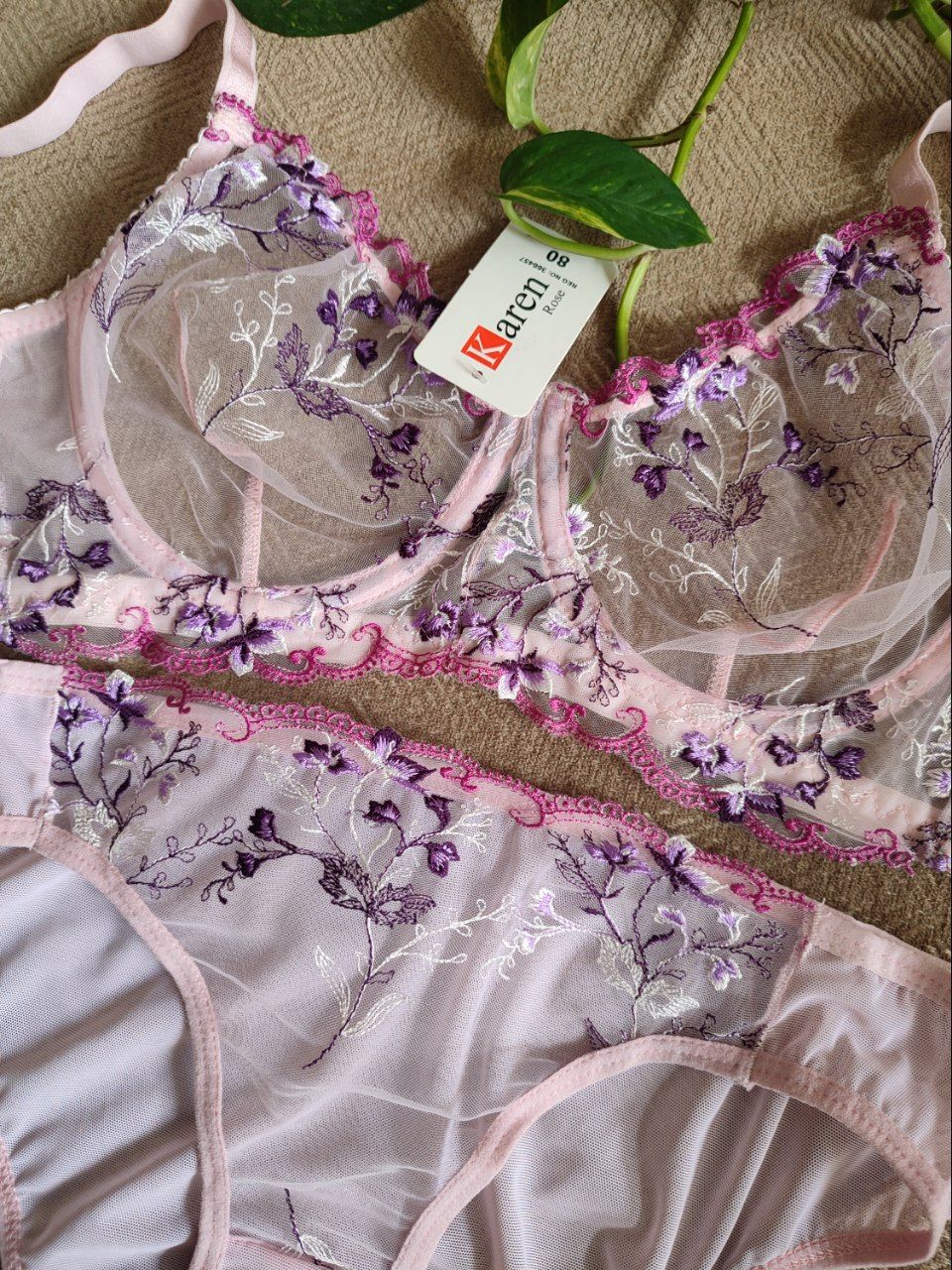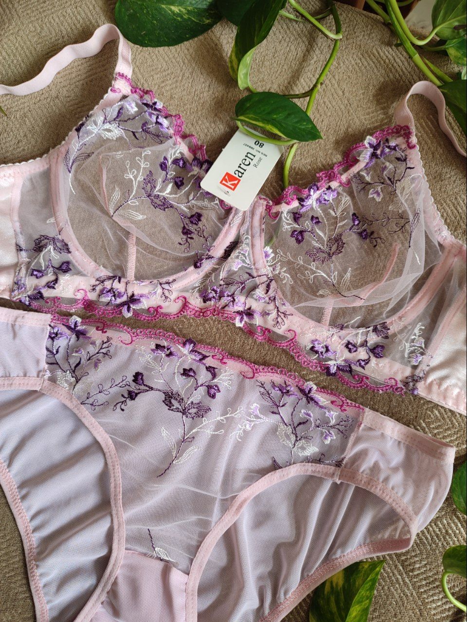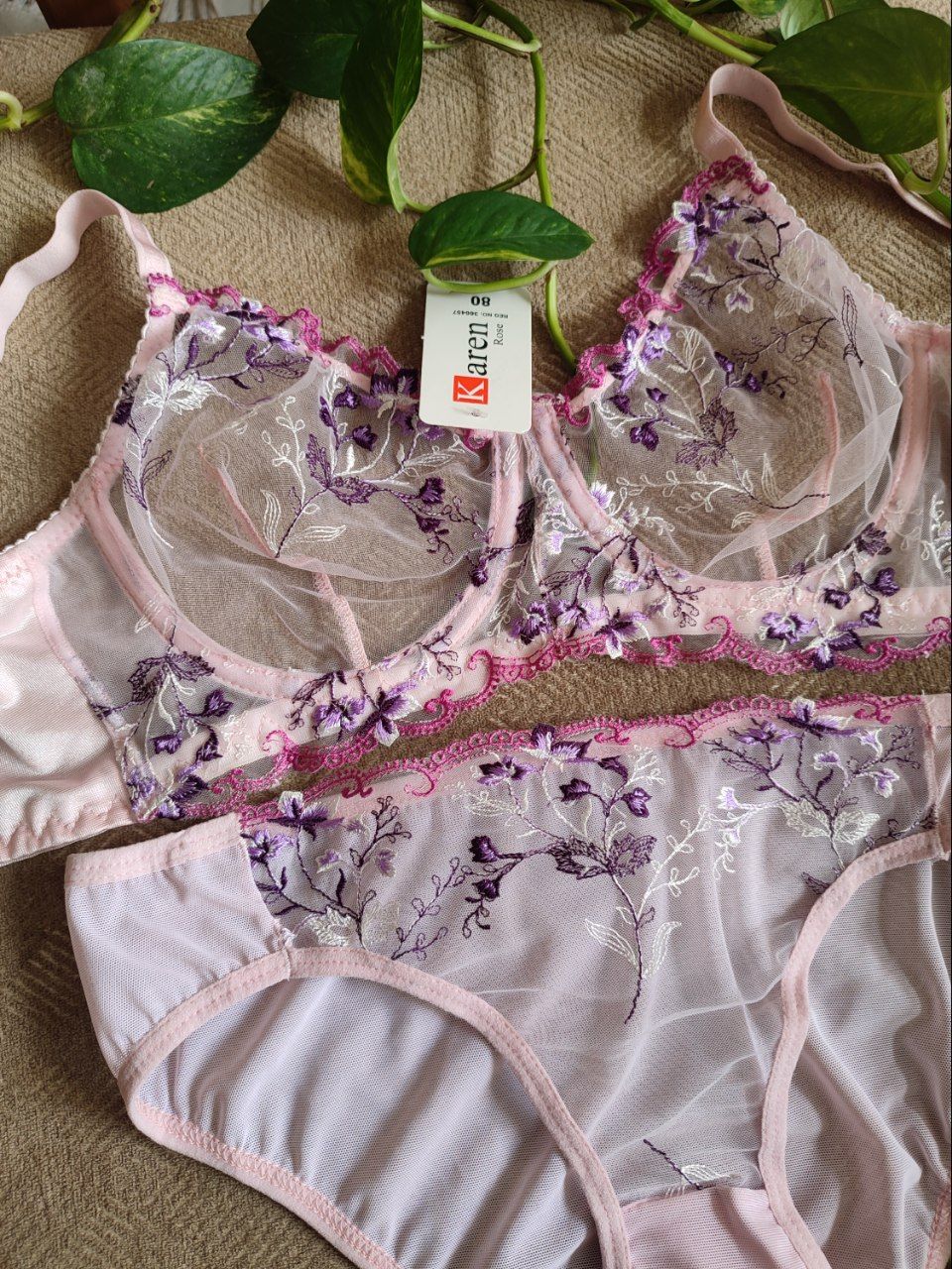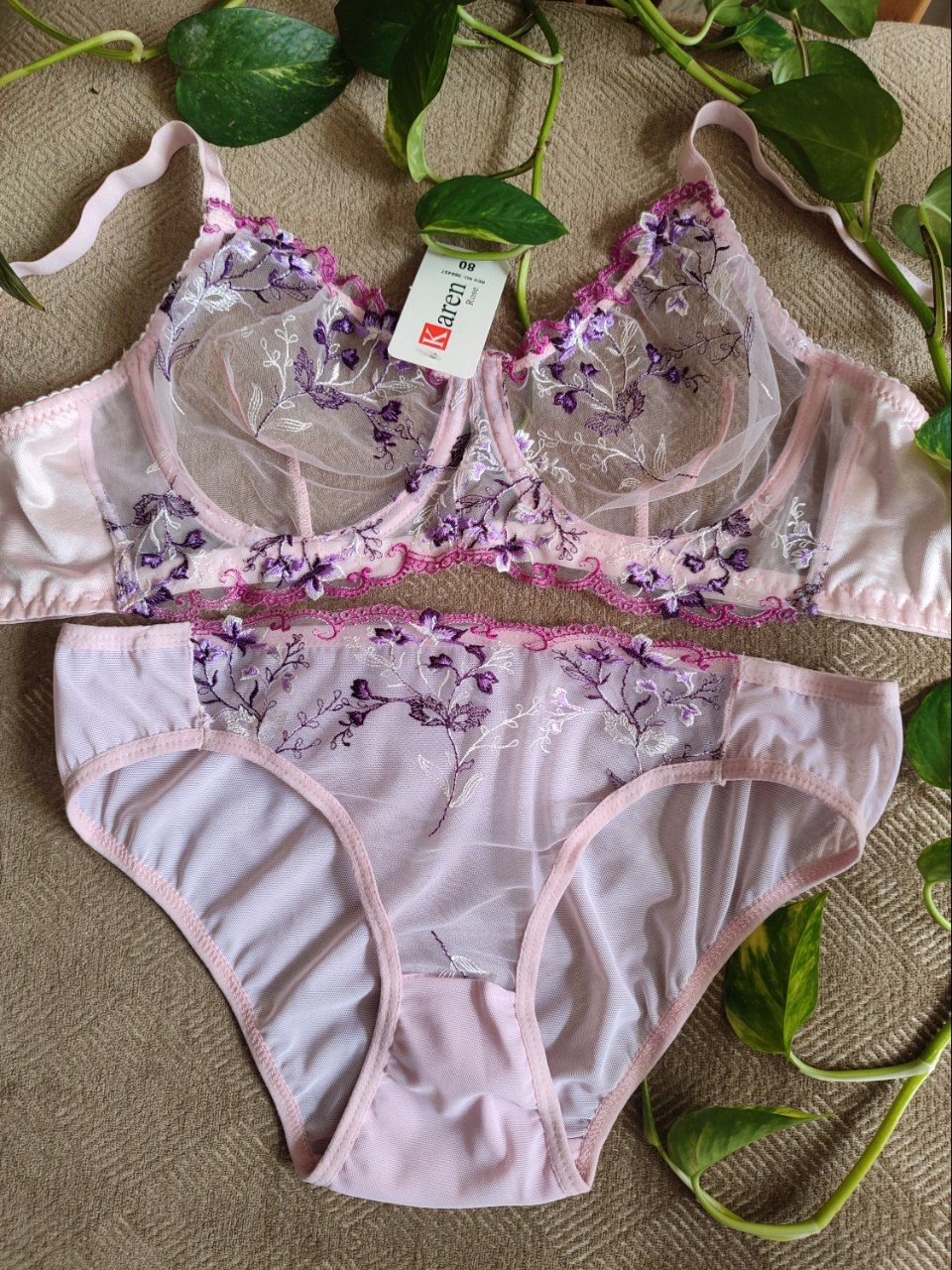 ست لباس زیر زنانه فنردار توری گلدوزی برند کارن رنگ صورتی