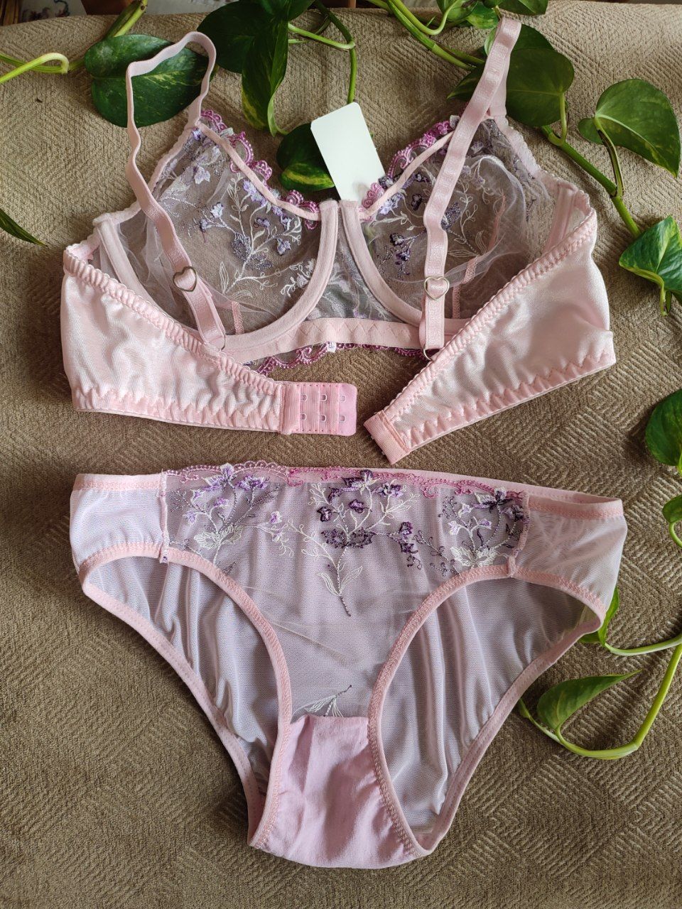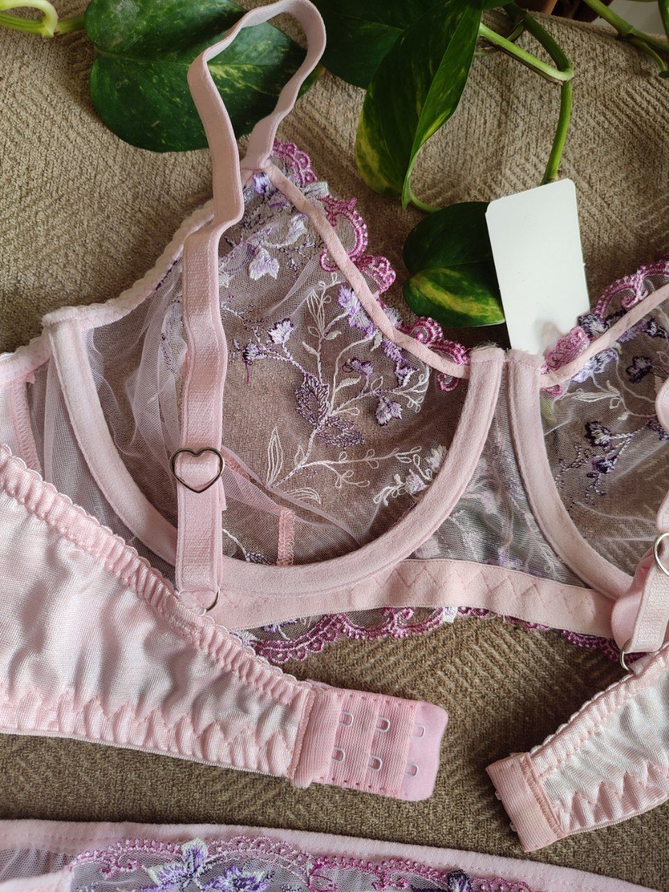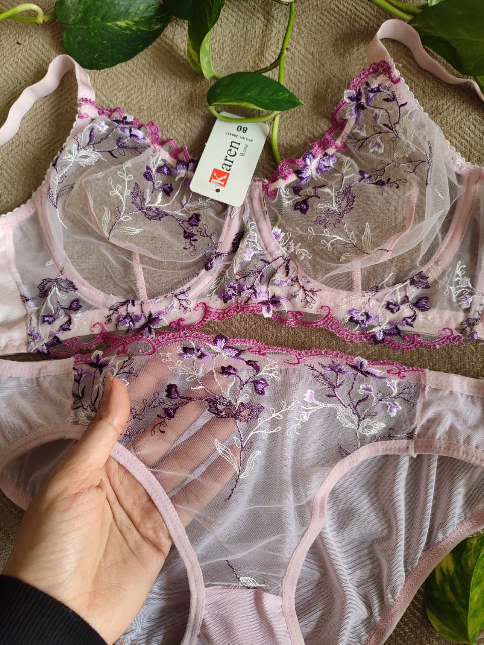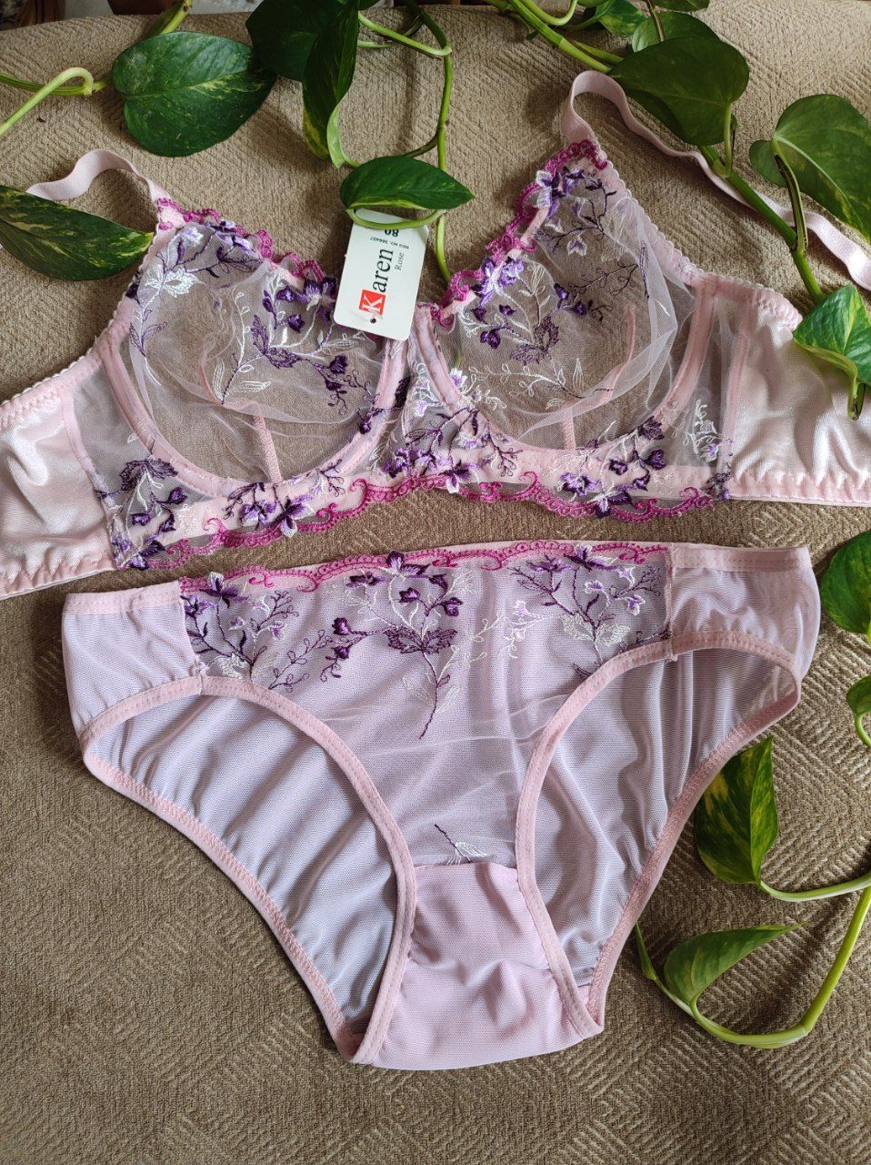 ست لباس زیر زنانه فنردار توری گلدوزی برند کارن رنگ صورتی
