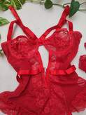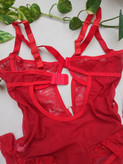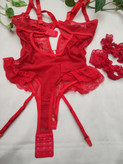 لباس خواب زنانه بادی توری فنردار قزن دار به همراه ران بند رنگ قرمز