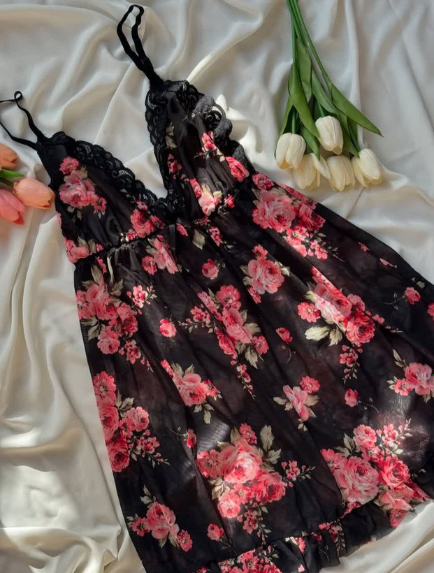 لباس خواب پیراهنی توری گلدار همراه شورت لامبادا