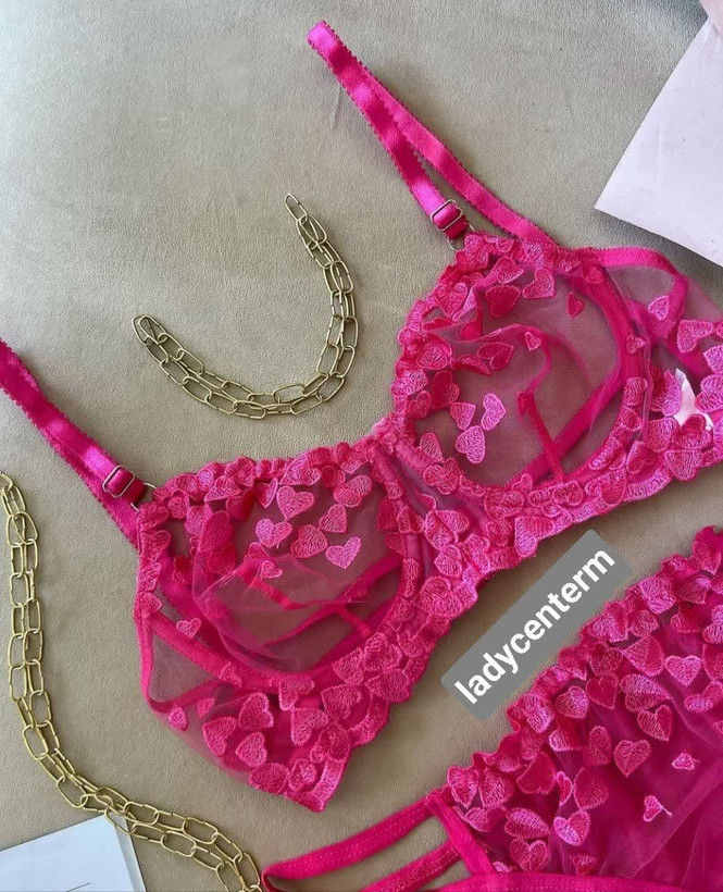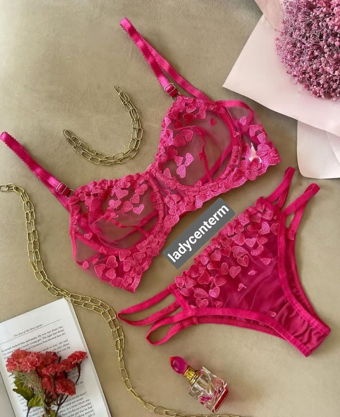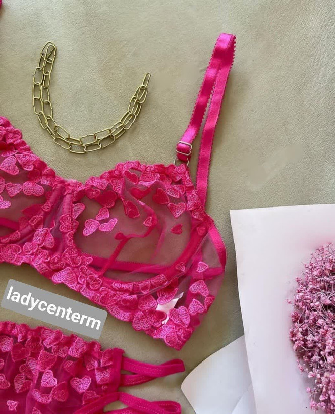 ست لباس زیر فنردار زنانه توری قلبی رنگ سرخابی