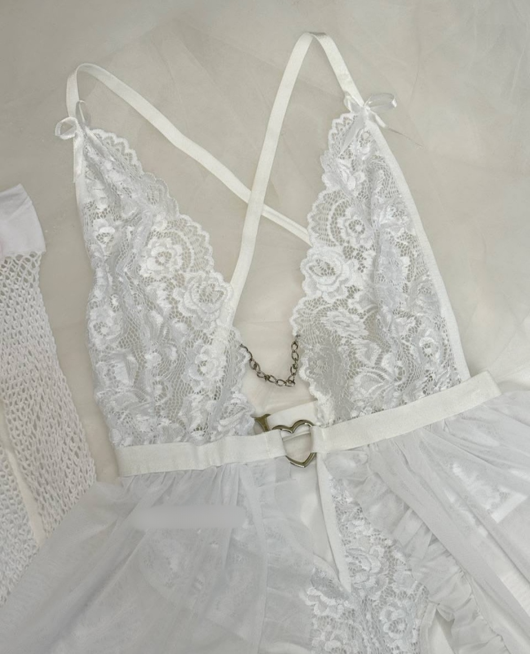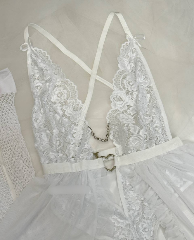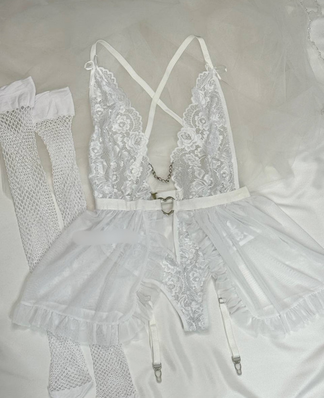 لباس خواب بادی دامنی همراه جوراب بالای زانو رنگ سفید