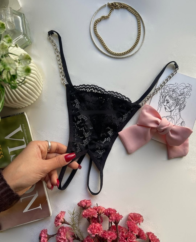 شورت فانتزی زنانه دانتل بند زنجیری فاق باز رنگ مشکی
